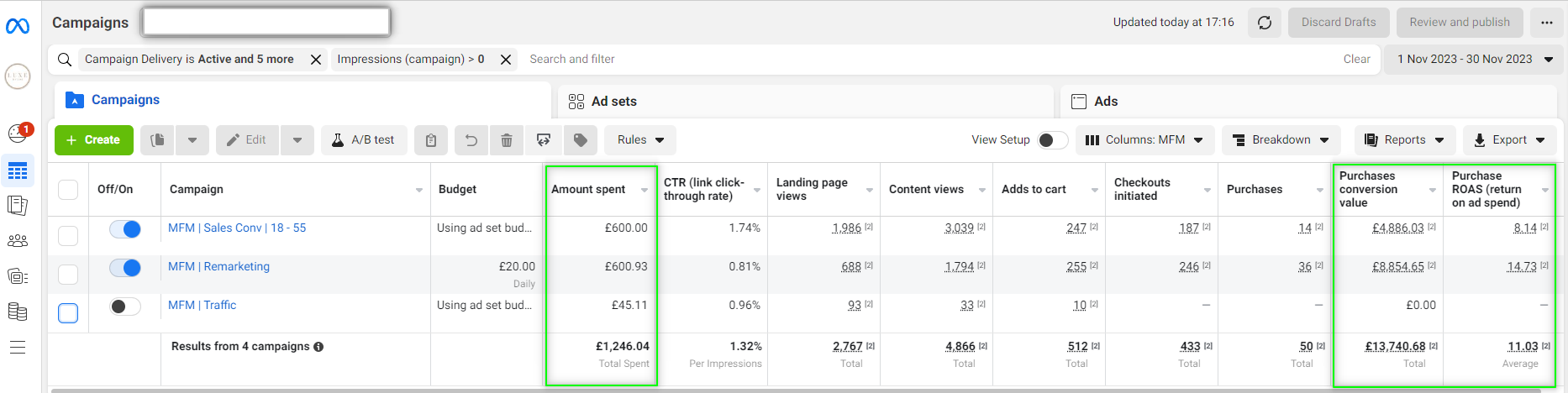 As Instagram is intergrated within a Facebook Ads account, there is a centralised billing menu for all advertsing activity. We look at the spend allocation between Facebook and Instagram and reallocate budgets accordingly based on the best performing placements for sales or leads.